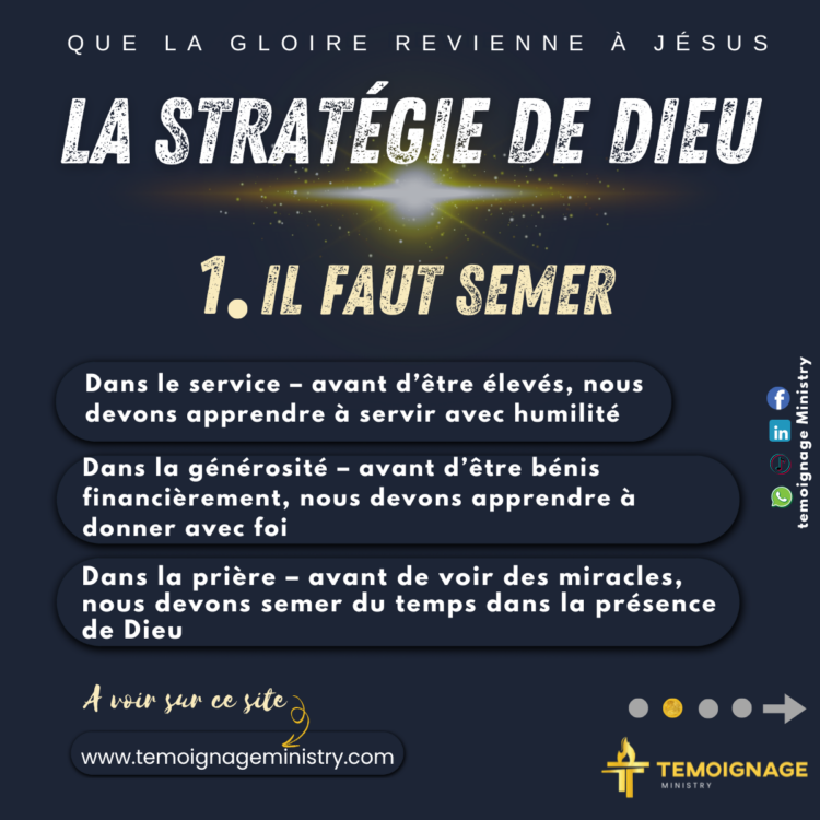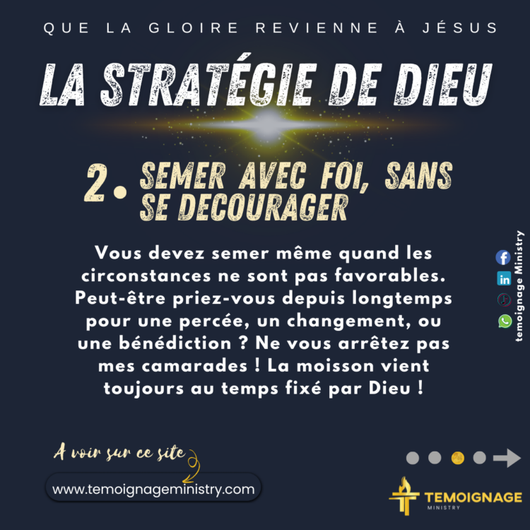 Dieu est fidèle à Ses promesses. Lorsque nous semons avec obéissance et persévérance, nous récoltons au-delà de nos attentes. La clé est de semer avec un cœur pur, sans attendre immédiatement en retour, mais en ayant confiance que Dieu récompensera au moment opportun.